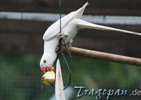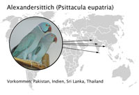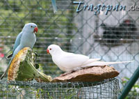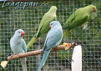 In die oft selbstgefertigten Baumhöhlen legen die Weibchen 3-4 weiße, rundliche Eier, aus denen nach 20 Tagen die Jungen schlüpfen. Beide Eltern teilen sich das Brutgeschäft und füttern die Nestlinge mit hochgewürgter Nahrung. In ihrer Heimat sind diese Papageien als "Haustier des kleinen Mannes" sehr beliebt. Oft treten sie als Akrobaten in Wanderzirkussen auf. Die Vögel einiger Gebiete Indiens sind sehr sprechfreudig und werden zu hohen Preisen gehandelt |