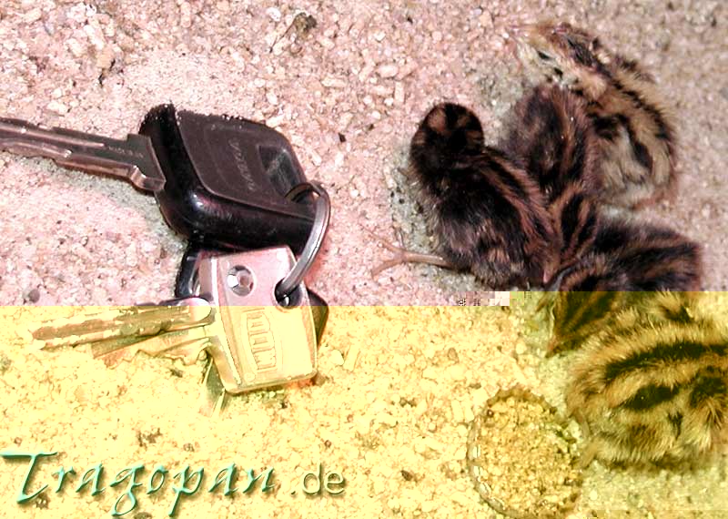 Chinesische und europäische Wachteln, 24 Stunden alt, zum Größenvergleich ein Schlüsselbund und ein Kronkorken mit Futter